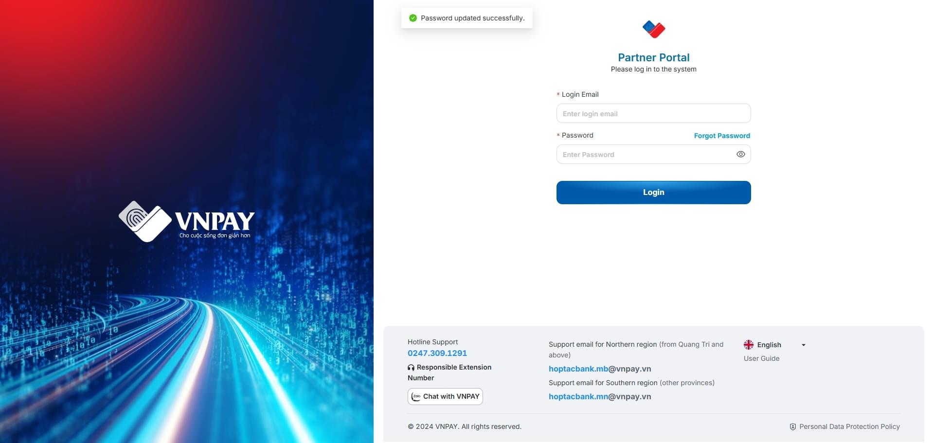 The user will be redirected to the Login screen and a message will be displayed: Password updated successfully